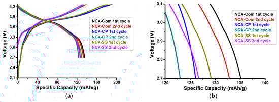 (a) Charge-discharge curve of NCA-CP, NCA-SS and NCA-Com during the first and second cycle and (b )Specific discharge curve of NCA-CP, NCA-SS and NCA-Com Zoomed at 2.7 V