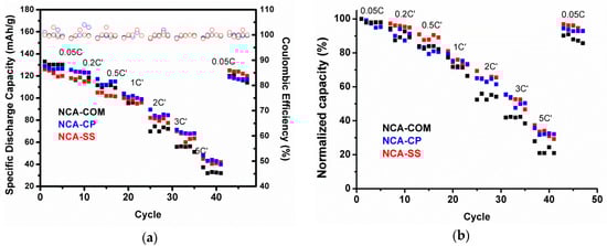 The rate-ability of NCA samples is shown in Figure 7 using a standard testing procedure in which the charging and discharging rates were set using the actual capacity presented in Table 5 (C’) rather than the theoretical capacity (C). After the cells went through the formation phase for five cycles, the cells were charged at 0.5 C’ and discharged at various discharging rates. Based on Figure 7, sample NCA-SS and NCA-CP have a similar rate performance behavior and are relatively comparable to commercial NCA. Surprisingly, at a higher rate, NCA-SS and NCA-CP are superior compared to commercial NCA. Such a phenomenon occurred due to the higher surface area of the as-prepared samples. At high current rates, the performance of cells depends on the Li ion mass transfer and diffusion kinetics. Therefore, even though a large surface area promotes side reactions, it becomes beneficial during a high rate discharging process [17]. To prove the reversability of the material, the cells were charged and discharged using the first rate (10 mA/g or 0.05 C). From the figure, it appears that all samples exhibit a small capacity drop, even after being discharged at high current rates.
