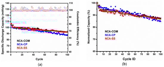 Figure 8a shows the cycle performance of NCA-CP and NCA-SS, respectively. The normalized capacity in Figure 8b refers to the actual capacity, the initial capacity, of each sample. NCA-CP and NCA-SS have similar cycling behaviors for 100 cycles at 1 C’ rates and have a capacity retention of 84.4% and 86.3%, respectively. The capacity drop occurred during the initial cycles; however, after three to four cycles, the capacity is considered stable after 100 cycles. The capacity drop phenomena is similar to the study result of Zhang et al., hence the capacity drop of samples in the NCA-battery resulted from impedance rising and cell polarization [43]. Overall, the cycle performance of NCA-CP and NCA-SS is comparable to the commercial NCA. Major problems in NCA commercialization rely on the synthesis methods. Based on the electrochemical performance test results, more feasible, scalable, and commercially attractive methods, such as facile batch co-precipitation and the solid state method, could produce NCA cathode material with comparable performances to commercial NCA which is produced by a continous co-precipitation process. In addition, the use of technical grade raw materials in NCA-CP provides stronger evidence on the merits of the method. Overall, NCA-SS shows a slightly better performance compared to NCA-CP. The higher I003/I104 value based on the XRD pattern and better morphology according to the SEM result might be the reasons behind the difference in the performance, specifically in terms of the capacity.