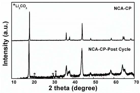 Post-structural analysis was performed to investigate the reason for low capacity loss during the first cycle. The XRD patterns of the NCA-CP pre-cycle and post-cycle are displayed in Figure 9. From the figure, impurities are clearly observed at two theta around 20–32°, which could be indexed with Li2CO3 (JCPDS card no. 87-0729). The formation of Li2CO3 or other carbonate compounds such as ROCO2Li occurred due to side reactions between the electrolyte and the cathode material promoted by the large surface area of aggregates, confirming previous results [31,35,42]. The post-cycle sample patterns have a broader peak compared to the pre-cycle sample, which indicates a decrease in crystallinity; however, the layered structure of the NCA sample is not altered after cycling and is proven by lattice parameter analysis listed in Table 6. The sample exhibits a slight cell volume change (less than 1 Ǻ3) after the cycle and slight decrease in the I003/I104 ratio, which indicates a rigid structure and minimum Li+/Ni2+ mixing in the lattice, respectively, resulting in a good cycle-ability and reversibility during rate performance.