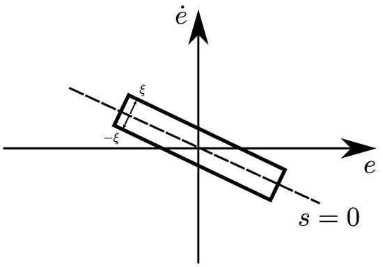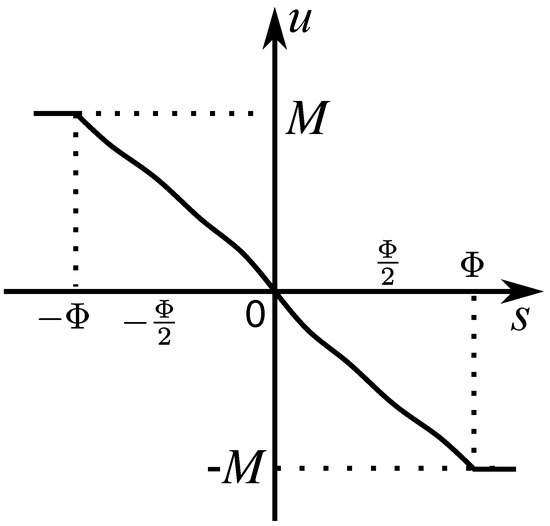 As the term is a discontinuous term, which causes high frequency oscillations in the control system, the function sign is replaced by the sigmoid function defined by Equation (20) and Figure 6. As has been validated in [27,28], the controller with a sigmoid function, as in Figure 6, is a boundary-layer controller, which presents the robustness verified by the Lyapunov analysis using the function in Equation (22).