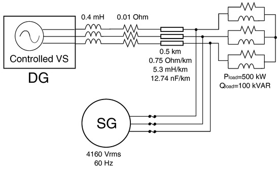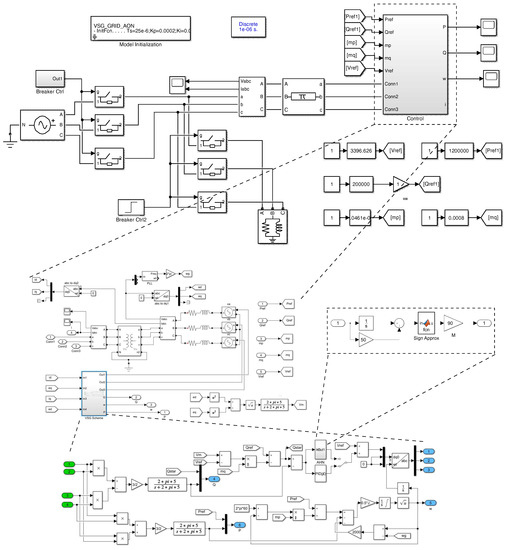 In order to validate the proposed control scheme, the circuit presented in Figure 7 is implemented in Matlab-Simulink (2018a, MathWorks, Natick, MA, USA), where the block named DG (Distributed Generator) contains the scheme of Figure 3, which regulates the controller voltage source (VS), and the parameters of the filter and loads. The parameters of the VSG Equations (1)–(6) are as follows: , , and . Figure 8 shows the Simulink blocks used for the simulation.