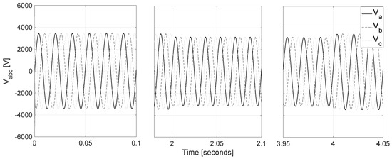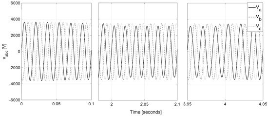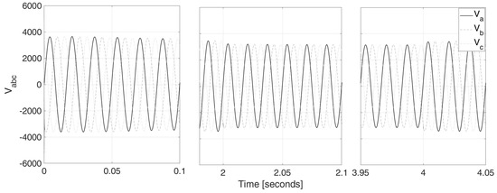 The voltages for Tests 1 and 2 are presented in Figure 11, Figure 12, Figure 13 and Figure 14, respectively. The voltages sag at 2 s and where it is removed at 4 s can be observed.