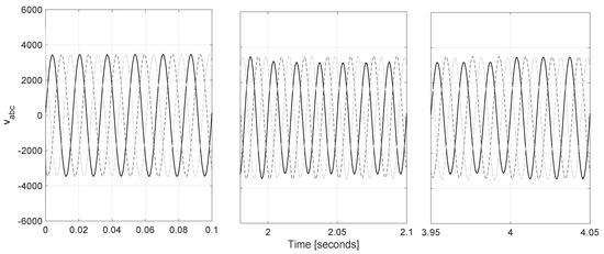 Adding Equation (8) into Equation (24), and assuming the derivatives (since the inverter output voltages , are constants, see Equation (2)), we obtain
