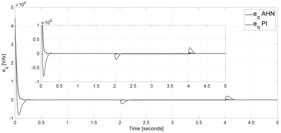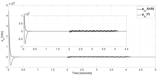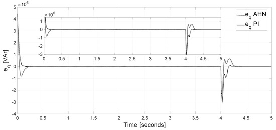 The regulation error, , for Tests 1–3, are presented in Figure 18, Figure 19 and Figure 20, respectively. One can observe that, during the changes resulting from the transition (0.5–1 s) and the voltage sags, the proposed AHN controller maintained a regulation error closer to zero, when compared with the PI controller. When the voltage sag appeared (disappeared) at 2 s (4 s), the PI control was not capable of regulating the reactive power in the reference, and moved away from zero; see Figure 18 and Figure 19. Additionally, when the DG was reconnected to the grid during Test 3 (see Figure 20), the system with PI control could not maintain the error closer to zero as the AHN control did. Thus, the proposed AHN is robust to voltage sags.