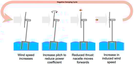 Currently, all large (3 MW+), variable speed, variable pitch, employ HAWTs pitch-to-feather to control the power output above rated wind speeds. Whether these turbines are fixed on dry land, the seabed, or floating offshore, they can experience a phenomenon when wind speeds exceed the rated wind speed, which is generally referred to as “negative damping”. This is due to a decrease in rotor thrust at constant rotor speed as the wind speed increases. This can then lead directly to tower fore–aft oscillation, hence, decreased tower axial fatigue life if not controlled, as illustrated in Figure 1 []. Fixed turbines can avoid the negative damping effect without a loss in performance as the natural frequency of the blade pitch control system is lower than the first resonance modes of the tower. However, for floating offshore wind turbines (FOWTs), the frequency of the motions (surge, sway, roll, and pitch) are one or more orders of magnitudes lower than for a fixed-base turbine, and therefore, the pitch controller frequency must be lower to avoid negative damping. This causes a reduction in the performance of the rotor speed when operating at above rated wind speeds, such that the ideal constant rotor speed fluctuates around the desired output, leading to more undesirable fluctuations in the generated power output [].