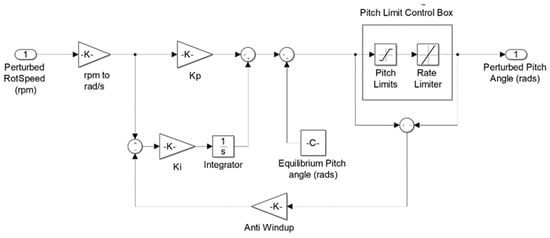 The collective blade pitch-to-stall control system that was designed for both the “Pitch-to-Stall Model” and the “Back Twist Pitch-to-Stall Model”, was a relatively simple feedback proportional-integral (PI) controller with constant gains derived at 18 m/s steady wind conditions, as shown in Figure 2. Utilizing a gain scheduler that relies upon the pitch angle at any moment in time to predict the gain change required would be much more complex with an active pitch-to-stall control. This is due to the double-valued nature of the pitch angle within region 3, as highlighted within Section 3.1. This controller pitches the blades to achieve a constant rotor speed when winds are above 11.4 m/s and incorporates a pitch-rate limiter set to +/−8°. This pitch-to-stall controller was implemented in Simulink, which was coupled directly with the FAST v8 simulation code. It expanded upon a simple “constant gains feedback” PI pitch controller designed for pitch-to-feather control by Wright and Fingersh [].