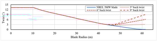 The back twists employed in this study were chosen after investigative research of the altered dynamic coupling effects on the tower, due to the changes in the blade geometry, specifically in terms of tower base fore–aft moment. The initial selection process looked at back twist applied at initiation points from 5% to 35% in 10% intervals along the blade length (measured from the tip), with a “best guess” back twist angle of 3°, based on previous research involving back twist on passive stall blades [] and blades that pitch-to-feather []. Responses during mean turbulent winds of 18 m/s for short 600 s simulations were examined. The effects on tower fore–aft bending moment were then analyzed when both increasing and decreasing the back-twist angle, which indicated a reduction in tower fore–aft moment range could be achieved with a higher back twist angle of 9°. The initiation point of the back twist was chosen to be at 25% along the blade length, from the tip. Figure 3 gives a visual reference to the three back twist angles applied to the “Back Twist Pitch-to-Stall Model”, alongside the original twisted NREL 5 MW blade which is used for both the “Feather Base Model” and the “Pitch-to-Stall Model”.