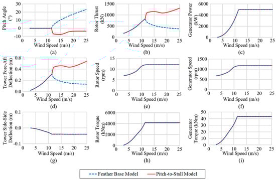 From the simulated rotor thrusts in Figure 4b, it can be seen that, at wind speeds above rated, the rotor thrust curves were the inverse of the required pitch angle curves for both the pitch-to-feather and pitch-to-stall control methods. The tower fore–aft deflections curves, shown in Figure 4d, followed the same pattern as the rotor thrusts experienced by the relative control method. The outputs of all other parameters observed in Figure 4 were identical and are presented to show the specific responses for both control methods.
