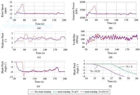As well as a large overshoot in the blade pitch angle, such that the angle increases from around −8° to nearly −12° (Figure 5e), oscillations were also seen as the system returned to a stable state. This can clearly be seen by the response shown in red in Figure 5c,d for the platform pitch motion and the tower fore–aft bending moment, respectively. These oscillations lasted for up to 100 s after each rotor over-speed occurrence. These undesirable responses, along with rotor speeds far exceeding the design limit, cannot be tolerated by the turbine, hence, an anti-windup filter was incorporated to feed back into the pitch-to-stall controller design (Figure 2). The anti-windup filter changes the gain value of the integral during saturation and prevents the rotor speed from erroneously over-shooting. The anti-windup filter is inactive except when the floating wind turbine is operating near to the rated wind speed, as the pitch angle is the same at the input and output of the pitch-limit control box under these conditions (Figure 2).