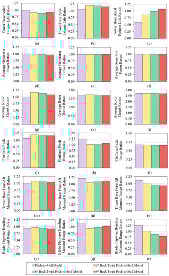 Simulation outputs for pitch-to-stall blade models with and without back twist. Outputs were normalized against the “Feather Base Model” and given for 8 (left), 13 (center), and 18 m/s (right) mean turbulent winds. (a) tower base axial fatigue life ratios (TBAFLR)(8mps); (b) (TBAFLR) (13mps); (c) (TBAFLR) (18mps); (d) average generator power ratios (AGPR) (8mps); (e) AGPR (13mps); (f) AGPR (18mps); (g) average rotor thrust ratios (ARTR) (8mps); (h) ARTR (13mps); (i) ARTR (18mps); (j) platform pitch range ratios (PPRR) (8mps); (k) PPRR (13mps); (l) PPRR (18mps); (m) tower base fore-aft moment range ratios (TBFARR) (8mps); (n) TBFARR (13mps); (o) TBFARR (18mps); (p) blade flapwise bending moment range ratios (BFBMRR) (8mps); (q) BFBMRR (13mps); (r) BFBMRR (18mps).