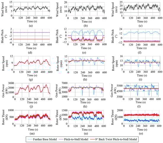 Simulation outputs for pitch-to-feather and pitch-to-stall blade models without and with 9° back twist at 8 (left), 13 (center), and 18m/s (right) mean turbulent winds. (a) wind speed, m/s (8mps); (b) wind speed, m/s (13mps); (c) wind speed, m/s (18mps); (d) blade pitch, ° (8mps); (e) blade pitch, ° (13mps); (f) blade pitch, ° (18mps); (g) rotor speed, rpm (8mps); (h) rotor speed, rpm (13mps); (i) rotor speed, rpm (18mps); (j) generator power, kW (8mps); (k) generator power, kW (13mps); (l) generator power, kW (18mps); (m) rotor thrust, kN (8mps); (n) rotor thrust, kN (13mps); (o) rotor thrust, kN (18mps).