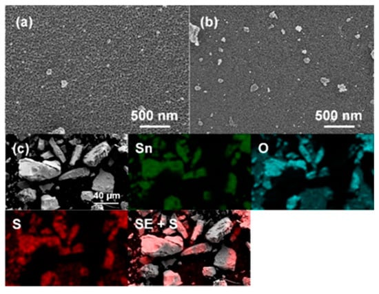 To investigate the surface morphological properties of intact tin oxide (SnO2) and sulfated tin oxide (SO42−/SnO2), field emission-scanning electron microscopy (FE-SEM) observation was carried out. The SEM images in Figure 1a,b show that intact SnO2 has a rough surface, whereas SO42−/SnO2 exhibits a smooth one because, although both surfaces consist of globular nanoparticles, the size of the nanoparticles in SO42−/SnO2 was much smaller than that of the nanoparticles in intact SnO2. Energy dispersive spectroscopy (EDS) analysis confirmed the presence of sulfur-containing groups on the surface of SO42−/SnO2 (Figure S1a–d). In addition, elemental mapping images clearly show a uniform distribution of sulfur atoms on the surface (Figure 1c and Figure S1e).