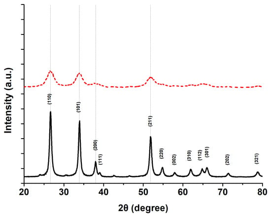 X-ray diffraction patterns of intact SnO2 (black line) and SO42−/SnO2 (red dashed line). The samples were calcined at 550 °C. On the basis of the ICDD powder diffraction file (PDF 00-041-1445), the peaks were indexed as tetragonal crystal structure as cassiterite SnO2 (P42/mnm space group).