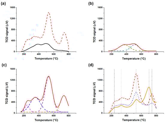 (a) Temperature programmed desorption of ammonia (NH3–TPD) profiles of intact SnO2 (black line) and SO42−/SnO2 (red dashed line); (b–c) Deconvolution of overlapped peaks in the profiles. The samples were prepared by calcination at 550 °C for 4 h; (d) NH3–TPD profiles of SO42−/SnO2 calcined at 550 °C (red dashed line), 600 °C (blue dotted line), and 650 °C (orange line).