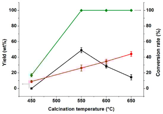The effect of the calcination temperature on the acidity of the sulfated catalyst was evaluated based on the amount of NH3 uptake (Table 1). Generally, increasing the calcination temperature reduces the total acid sites of sulfated or phosphated solid acid catalysts [,]. Our results coincide with those reported. However, one difference was found above the 600 °C calcination temperature, with a new peak centered at approx. 696 °C appearing and the disappearance of the peak centered at approx. 736 °C in the TPD profiles (Figure 3d).