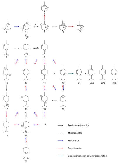 Plausible mechanism of isomerization of α-pinene over sulfated tin oxide catalyst: α-pinene (1); pinanyl cation (2); bornanyl cation (3); tricyclene (4); isocamphanyl cation (5); camphene (6); p-mentha-1-en-8-yl cation (7); p-mentha-1-en-4-yl cation (8); limonene (9); terpinolene (10); α-terpinene (11); γ-terpinene (12); p-mentha-4(8)-en-2-yl cation (13); allylic carbocation I (14); isoterpinolene (15); allylic carbocation II (16); p-mentha-2-en-8-yl cation (17); allylic carbocation III (18); p-mentha-3-en-1-yl cation (19); p-mentha-3,8-diene (20); p-cymene (21); p-menthene isomers (22a–c).
