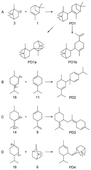 Examples of possible dimeric products of the coupling reaction of α-pinene catalyzed using sulfated tin oxide: (A) coupling of bornanyl cation (3) and α-pinene (1) giving possible dimeric product (PD1) and its isomers (PD1a–b); (B) coupling of allylic carbocation III (18) and α-terpinene (11) giving PD2; (C) coupling of allylic carbocation I (14) and limonene (9) giving PD3; (D) coupling of allylic carbocation II (16) and camphene (6) giving PD4.