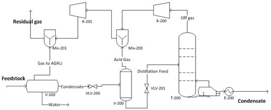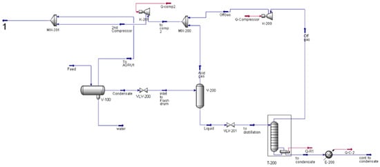 The HYSYS simulated process diagram of a gas stabilizing unit shown in Figure 3 is considered. The goal of the gas stabilization unit is to produce a condensate product with a RVP value between 10 to 12 psi. This range ensures that the light component of the stream will not be separated into a light gas phase while transporting the liquid stream. The separation of the feed stream is performed in a 3-phase separator (V-100) to remove the water and light components. The condensate is then expanded through (VLV-200) and sent to the flash drum (V-200). Acid gas is then removed in the flash drum, and liquid hydrocarbon which C6 represents most of it with a mass fraction of approximately 62% is expanded in VLV-201. The expanded stream is sent to the column (T-200) without a reflux unit that operates at a pressure of 250 kPa. C6 and heavy hydrocarbons are condensed in the column with a certain RVP, and light components are mixed with the acid gas outlet of the flash drum.