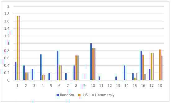 The maximum error on the performance for different sampling methods, sizes, and various combinations of the independent variables was calculated. Figure 4 shows a different maximum error in percentage for the different neural network fittings. In 4 cases (test numbers 1, 8, 17, and 18) we found that the sampling using pseudo-random number has a lower maximum error when compared to LHS and HSS. We found that LHS and HSS in 12 other cases (test numbers 2, 3, 4, 5, 6, 7, 10, 11, 13, 14, 15, and 16) have better performance. In 2 other cases (test numbers 9 and 12), the three sampling methods performed equally well with no error. Thus, in most of the cases, the random sampling method showed significantly higher maximum error than LHS and HSS. The maximum absolute error did not show any sign of decreasing when the sampling space increased.