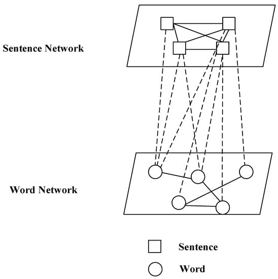 The NWS method is a keyword extraction method proposed in our published paper [23], which is based on complex network theory. Figure 1 demonstrates that the NWS method includes two layers: a sentence network in the upper layer and the word network in the lower layer. In the sentence network, the square represents a node (sentence), while the circle represents a node (word) in the word network. The relationship between the same node is represented by a solid line. When a node (word) in a word network exists in a node (sentence) in the sentence network, their relationship can be built and represented by dotted lines. Therefore, we obtain the synthetic eigenvalue of each node (word) for the NWS method as follows:
