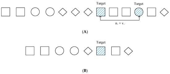 (A) A failure record with a combination target noun + verb (n. + v.). (B) A failure record with an insolate target (noun). Squares represent nouns, circles represent verbs, and other shapes represent the other parts of speech.