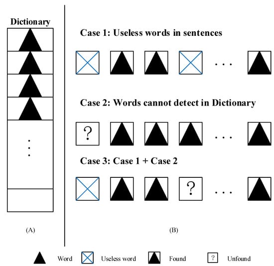 Collecting and establishing a dictionary from previous literature is a good start but is not enough. Since the dictionary has incomplete content, it prevents us from identifying the cause nouns in the sentence (fault record). Figure 3 shows an incomplete dictionary with three hidden situations. Case 1: A useless word exists in the dictionary, which means this dictionary must filter the useless words. Case 2: A useful word should be detected but is not in the dictionary, which means the dictionary is incomplete. Case 3: Both Case 1 and Case 2 occur. Basically, to solve these problems, we need to continuously expand the dictionary content through the task text and match the text to achieve the match function. Moreover, we also need to establish a text stopword list and filter and eliminate the text to supplement the dictionary. Incomplete words are reserved, and thus, filter functionality with the text is achieved. Therefore, the cause identification object is split into recognition reason nouns and verbs, and the identified tasks are split into establishing a cause dictionary and a deactivation dictionary.