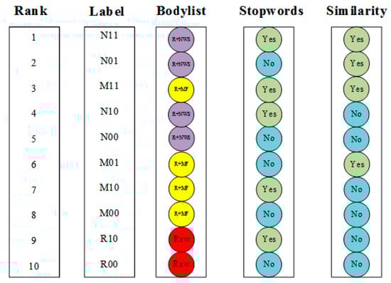 The letters R, N, and M indicate the keyword extraction method used in the dictionary section. R is the abbreviation for raw, which means that the dictionary is not built using any keyword extraction method, and only the first-generation dictionary newly created by the literature is used. N is the NWS keyword extraction method, and M is the MF keyword method. The number after the letter indicates whether the factor is considered in the method, whether one considers the stopword table for the merge operation, and whether the other considers the text similarity. For example, R00 indicates that the fault text reason identification uses only the first-generation dictionary and does not consider the stopword list and similarity; N11 indicates that the NWS keyword extraction method is used in this text failure cause identification to create a new dictionary and the stopword is used. The vocabulary is used to fuse the dictionary, and the text similarity is considered in the experimental calculation.