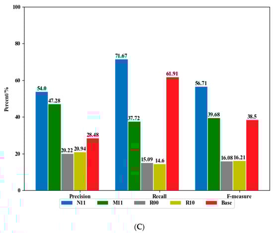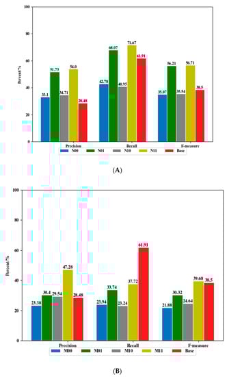 To better understand the relative performances of the RCI-NWS and RCI-MF methods, the trends in precision, recall, and F-measure values are shown in Figure 6. From Figure 6A, we can see that the bars of N01 (green) and N11 (yellow) are both always higher than the bars of base (red), which represents RCI-NWS using the NWS keyword extraction method. If the NWS keyword extraction method combines with a stoplist and similarity, the performance of N11 is the best. Similar results are shown in Figure 6B, but the performance of M11 demonstrates that its recall performance is not higher than that of the base. Furthermore, it can be observed from Figure 6C, comparing the best performance in RCI-NWS (M11), RCI-MF (N11), base and original (R00,R01), the highest value of the three is for M11 (red); therefore, our proposed method exhibits the best performance.