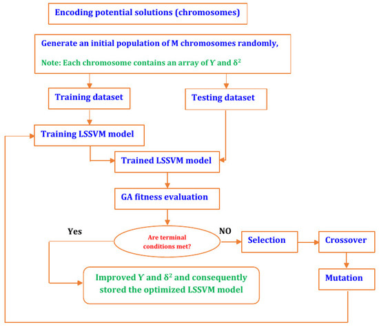 The preliminary stage of the Genetic Algorithm (GA) procedure is to form the primary population. Then, every stage is precisely assessed to form a statistical fitness function. In the following, every stage should be evaluated to be compatible. The “global best satisfactory” result, which is the result with a range of acceptable error, ended the algorithm, and then, the parameters were extracted and reported. When the global best satisfactory result was not achieved, weaker individuals were opted to be deleted in the next stage. In the next stage, in order to decrease the error, mutation and cross-over operations were applied. This stage is then called the “evaluation fitness” [68,69,70,71]. The process of the genetic algorithm LSSVM is demonstrated in Figure 1.