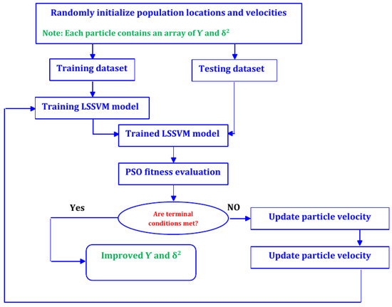 At the commencement of Particle Swarm Optimization (PSO), pattern arbitrary locations and velocities are used to initialize the primary population. The particle’s fitness is then performed by utilizing the statistical function. The desired factors are extracted, when the particle’s fitness rate meets the stopping norms. In the cases that the desired fitness rate is not achieved, in order to fulfil the requested rate, the particle’s velocity and locations are varied under specific conditions. In the first step, the global best factor should be evaluated and used to monitor how the particle fitness is in comparison to the global best. An update to the pertinent factors of the prime particle is needed when the fitness is greater than the global paramount fitness. At last, subsequent particles should be assessed again by changing the direction to the 2nd stage [73,74,75,76]. The schematic process of the PSO-LSSVM is illustrated in Figure 2.