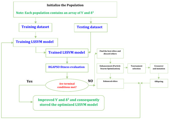 This hybridization is started by arbitrarily forming the primary population and its following assessment. The process is stopped when the regulated values of the amount of produced error of the best individual is achieved. If the regulated values are not met, then the procedure continues to reach toward the closest acceptable range by utilizing the PSO algorithm. In this algorithm, the number of leaders are increased, tournament selection is carried out based on the chaining processes, mutations and cross-over operations are applied and, finally, the fresh offspring are generated. New populations with improved characterizations of elites and offspring are generated by merging the effects of these two methods with each other [77,78]. The box chart of the Hybrid GAPSO-LSSVM method is shown in Figure 3.