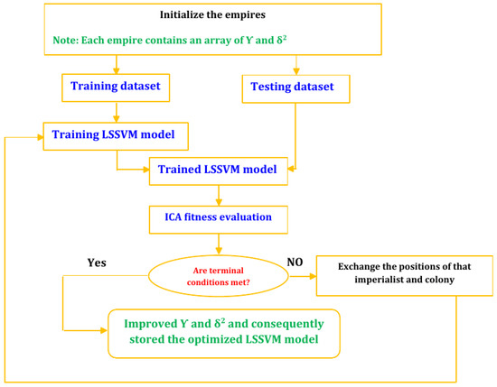 Imperialist Competitive Algorithm (ICA) follows a similar process as GA to solve optimization problems. However, ICA is based on a human socio-political organization and evolution strategy instead of the biological evolution of GA. ICA creates several social domains, transferring a number of colonies to their related domains. Then, the colony’s cost of an empire should be evaluated. A variation in the locations of domains and colonies is needed when the colony’s cost is high for a specific domain. After that, the cost of all domains is computed in the next step. In the following phase, the greatest colony of the greatest domain owns the colony with the lowest potential. Afterwards, all domains without colonies should be cut. The next level is to examine the breaking sets to monitor the amount of satisfaction to cease the algorithm [79,80]. The schematic diagram of the ICA-LSSVM method is demonstrated in Figure 4.