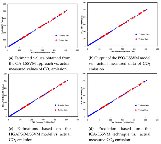 The predicted obtained values through the GA-LSSVM model in comparison to the real amount of measured carbon dioxide emission for South America is depicted in Figure 7a. In order to obtain the best linear fit line between the predicted and real amount of CO emission, a correlation coefficient of 0.9965 resulted in the GA-LSSVM. The closeness of the coefficient to the unit demonstrates that the forecasted and measured data points were similar. The scatter plot of the amount of forecasted CO emission through PSO-LSSVM vs. the measured data is illustrated in Figure 7b. Applying the PSO-LSSVM method resulted in the correlation coefficient of 0.9957 for the best linear fit line between the predicted and measured values of CO emission. It can be seen than the calculated correlation coefficient was closer to unity in PSO-LSSVM than the GA-LSSVM method, and it can be stated that the precision of PSO-LSSVM model was higher and the estimations close enough to the measurements of the carbon dioxide emission. The regression plot of the obtained results from the HGAPSO-LSSVM method and related actual amount of carbon dioxide emission is demonstrated in Figure 7c. The regression of the predicted results through the ICA-LSSVM model in comparison to actual measured data of the carbon dioxide emissions is depicted in Figure 7d. As can be clearly understood, based on the values of the correlation coefficient, the ICA-LSSVM approach gained the lowest amount among all other models, including PSO-LSSVM, GA-LSSVM and HGAPSO-LSSVM.