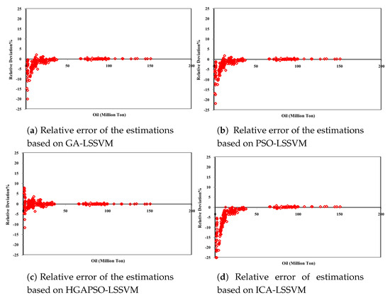 It was concluded that among all the discussed methods, the HGAPSO-LSSVM technique was more accurate based on the obtained correlation coefficients. In addition, the relative deviation of the calculated results through the discussed methods vs. corresponding oil production (million tons) is demonstrated in Figure 8. It can be seen from Figure 8a that the obtained results from the GA-LSSVM model deviated from actual measured carbon dioxide emission values by 20%. This means that the deviation of the obtained results by the GA-LSSVM model from the real measured amount of carbon dioxide was about 15%. It can be understood from Figure 8b that the deviation of the obtained results through the PSO-LSSVM model was in the range of 22%. It can be stated that the error of estimations from the PSO-LSSVM model was between the error lines of −22% and +22%. The relative error graph of the estimations based on the HGAPSO-LSSVM model in comparison to the actual measured data to carbon dioxide emission is depicted in Figure 8c. It can be clearly seen from Figure 8c that the highest error of the HGAPSO-LSSVM model was in the range of 12%. The relative deviation results of ICA-LSSVM model are shown in Figure 8d. It can be seen from Figure 8d that the highest deviation of the ICA-LSSVM approach from actual CO emission was −22%. The relative error distribution shows that the HGAPSO-LSSVM method had dominance in comparison to the other discussed LSSVM models. Overall, two dependable statistical benchmarks including Average Absolute Relative Deviation (AARD%) and MSE were applied to determine powerful intelligent techniques among the recommended LSSVM models.