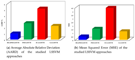 The obtained AARD (%) from the LSSVM methods and the actual logged data of carbon dioxide emissions are compared and demonstrated in Figure 9a. In addition, Figure 9b depicts the comparison between the resulting MSE of different LSSVM models. It can be seen from Figure 9 that the HGAPSO-LSSVM technique is an accurate and precise method for estimating CO emission in gas injection processes.