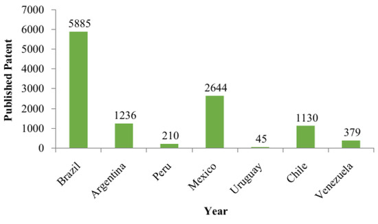 The patent analysis result of the technology trend for mitigation of CO shows that Brazil with 5885 patents is the leader in mitigation of CO emission technology so far. All the published patents of the South American countries are illustrated in Figure 10.
