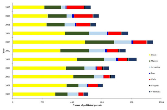 After finding key codes, the patents of Brazil, Argentina, Mexico, Peru, Venezuela, Chile and Uruguay were analysed. The extracted patent database covered 1970–2017.