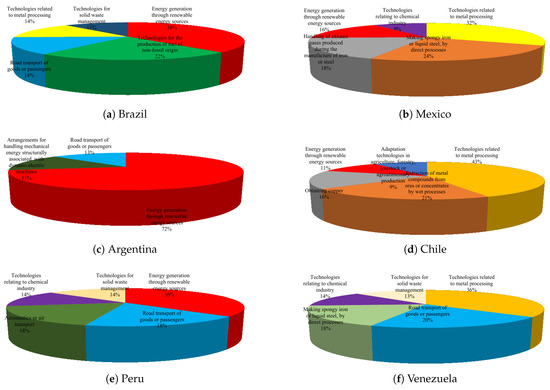 Brazil and Mexico have the biggest economies in Latin America, which determines their remarkable role in CO mitigation. Although the CO emission from Brazil and Mexico is not the highest one, their policy and program to enhance mitigation action are considered globally [87]. Argentina has the fourth biggest economy in Latin America. In spite of being a relatively small CO emitter, Argentina has made efforts to mitigate CO emission recently. Peru is one of the countries that ratified the Paris agreement. The annual rate of CO emission of Peru in 2016 was 2.67%, which determines 0.68 metric tons CO, increasing from 1997–2016 [88]. As is obvious in Figure 11, Uruguay patent trends have not increased or faced a considerable change during the last decade. About 80% of CO in Uruguay was produced by the agriculture sector in 2013 [89]. According to its GDP, Venezuela has the seventh largest economy in Latin America. The main source of CO emission is energy in Venezuela. The total produced CO by Venezuela in 2014 was 6.03 metric tons [89]. Chile is another important Latin American country with a high GDP. The total CO emission by Chile in 2016 was 5.45 metric tons [90]. To find out the technological orientation of the mentioned Latin countries, the main technology groups of each country’s patents are illustrated by Figure 12, which considers the technologies for mitigating CO emission published as patents by the mentioned Latin American countries, except Uruguay. The reason for considering Uruguay as an exception is the low number of patents. Only 45 patents have been published by this country, which demonstrates that the major activity by Uruguay is to promote renewable energies. Being a developing country and less industrialized, and not significant, does Uruguay have an influence on CO emission? However, the approach of Uruguay to reduce CO is promoting renewable energies. The energy sector in Uruguay contributed more than 90% of CO emissions, and the ambition is to reduce this by 29% by 2025 [91].