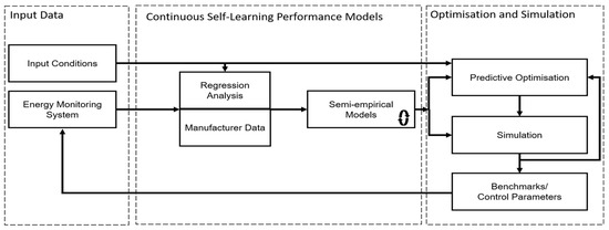 Former studies show that even two structurally identical compression chillers can perform differently in the same location [29]. This results in a need for empirical models for each utility operation. In operating areas with a significant quantity of energy data, empirical models describe the system performance. In other areas, extrapolating semi-empirical models is more accurate. The linking of physical and empirical modeling ensures an acceptable accuracy in both fields of interpolating and extrapolating. For the modeling of the utility, manufacturer and performance data are combined and continuously adapted to form part-load performance curve models. The existing and new data points are weighted differently in the continuous self-learning model. In considering changes in utility performance, recent data are weighted higher. If the characteristic curves are regularly adjusted over a longer period, the deviation between the previous and new characteristic curve decreases. The disadvantage of this method is that an irregularity in the measurement system or in the utilities leads to significant deviations.