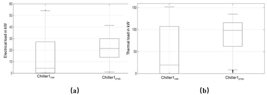 Statistical methods are used to identify incorrect values that pass through the analysis of system behavior. The filtering of values is performed for values smaller than a percentile (1% or 5%) or greater than a given percentile from 95% or 99%. This method is also applied to the rate of change of the recorded measurements to filter out extreme changes, especially for values of the electrical power. A special method is a classification from the minimum to the maximum condensing temperature into one Kelvin class. For this transformation, a matrix approach is used. The direction vector with the largest standard deviation is determined for each classified data matrix for PLR and EER. Outliers are determined in linear or non-linear data point distributions. The vector of the largest scatter indicates a transformed coordinate system for the size pairs of EER and PLR. In this coordinate system, further outliers are identified by the interquartile distance (IQR). In statistical studies, 1.5 times the IQR is often used to identify outliers. The analysis of energy monitoring data of six different compression chillers in three sites by the authors shows that this must be selected much smaller to filter out data. In this work, 0.5 times the IQR is used. The distribution of the data points in the respective classes is decisive for filtering out the values. The various methods are run through one after the other, starting with the method that takes the least time to calculate and filters out the most values. The order is important to minimize the total computation time. After the data pre-processing, the scattering and the number of large outliers for different measured variables were considerably reduced, shifting the median mainly due to the removal of the measured data in the switched off state. The change in the measured values after data pre-processing is shown in the following Figure 2.
