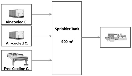 The evaluation of the optimization and the simulation is done by a case study on two plastic processing companies that produce injection-molded parts for the food sector. The purpose of the case study is to establish the level of possible energy cost savings for the considered site. The case study can provide motivation to the site to implement the new optimization approach as well as others to follow a similar procedure. This requires high hygiene standards for the production hall. One is located in Germany and the other in Spain. The variation of the location quantifies the influence of the ambient temperature on the results of the optimization. The injection-molding machines are cooled continuously by two different cooling circuits. The mold-cooling circuit is set at a temperature level of about 14 °C and the machine cooling at about 30 °C. The relatively high process cooling temperature of 14 °C offers the opportunity to integrate free cooling chillers as well as multiple compression chillers. The refrigeration of the molding circuit is carried out by two air-cooled compression chiller machines and a free cooling chiller, which is also used for winter relief. Cooling towers provide the cooling to machine cooling of the plastic processing machines. Moreover, the company has a 900 m³ sprinkler tank that can be used as a cold-water storage tank at a temperature level of 14 °C. The plastic processing companies often have large warehouses. Fire safety regulations require quick access to a high volume of extinguishing water. Because of the multiple operational states, the predictive simulations-based optimization is well-suited for the mold cooling circuit in the plastic processing industry.