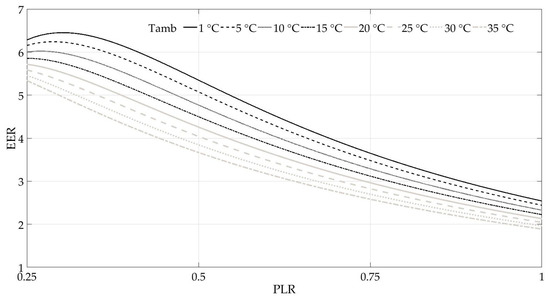 The following Figure 4 visualizes the partial load performance curve of the air-cooled chiller, according to the Gordon–Ng model, after data processing. The lower the ambient temperature, the higher the EER because of the lower condensing temperature of the chiller and less energy consumed by the fan of the condenser.