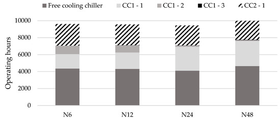 Figure 5 shows the different operating hours of the three chillers for a prediction horizon n between 6 and 48 h. The bottom bar represents the operating hours of the free cooling chiller. The ascending bars show operating hours of the first compression chiller for each stage and the top bar refers to the second compression chiller. Stage 4 of chiller one and stages 2–4 of chiller two are not used in any of the four cases.
