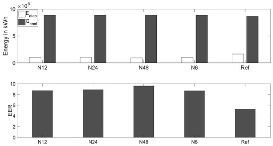 Due to the better efficiency of the free cooling chiller compared to the compression chillers, the electrical energy consumption decreases proportionally to its operating hours. In comparison, the reference case with standard control is also visualized. Figure 6 illustrates the total energy consumption for the four cases, with differing prediction horizons in scenario 2, the reference scenario, as well as the average EER for the year. The results show that the optimization reduces electrical energy consumption by around 38% (N6–N24). A prediction horizon of n = 48 decreases the electrical energy demand by another 5% because of the better charging and discharging strategy of the sprinkler tank.