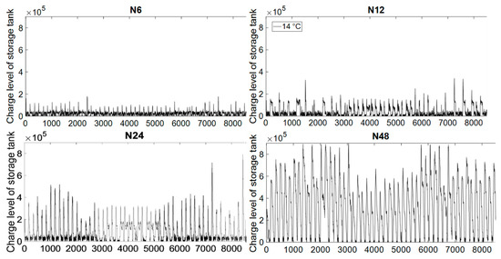 The difference in energy efficiency and the different operating hours of the free cooling chiller and the stages of the compression chillers result from the charging and discharging strategies based on the different prediction horizons. Figure 7 shows the charge level of the storage tank for the low supply temperature at 14 °C (black line) depending on the time of the year in hours for the four different prediction horizons. The charge level of the high temperature water of 17 °C is the mirror image of it. A prediction horizon of 6 or 12 h results in a minor usage of the energy storage potential of the tank. In the case with a prediction horizon of 24 h, the storage is charged and discharged over 50% of its full capacity in the first and fourth quarter of the year. The full capacity of the storage is used in the case with a prediction horizon of 48 h.
