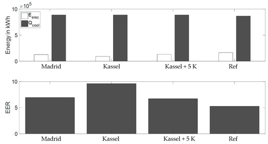 The efficiency of the free cooling chiller and the air-cooled compression chillers depend on the ambient temperature. Lower ambient temperatures allow lower condensing temperatures, resulting in better efficiency. If the ambient temperature is higher than 11 °C, the free cooling chiller does not provide the required cold-water supply temperature. Both effects have an influence on the energy-saving potential of the predictive simulation-based optimization. Hence, in scenario 3, the plastic processing company is moved to Madrid, Spain, to have a different ambient temperature profile. In scenario 4, the German temperature profile is lifted by 5 K. Figure 8 shows the total energy consumption and EER for one year in comparison to the reference case and scenario 2. All optimizations are based on a prediction horizon of 48 h, since the previous analyses in Section 4.1 conclude that this is the best horizon to maximize energy savings.