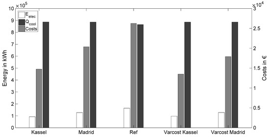 In the previous scenarios, the electricity price for the plastic processing company is fixed to 16 euro cent/kWh. In scenarios 5 and 6, the electricity procurement is via the day-ahead exchange market in Germany. All taxes, costs, and the German renewable energy levy are included in the model. To benefit from purchasing electricity with a variable price, it is required to shift loads. The sprinkler tank enables the cold utility system to store cold-water in times of little or no demand. This allows the optimization algorithm to start chillers in times of low electricity prices and stop the machines in times of high prices. This increases the optimization options. Figure 9 shows the results of the simulation for the variable cost option in comparison to the fixed price and the reference case. On the left y axis, the thermal and electrical energy consumptions are visualized, and the costs are shown on the right y axis.