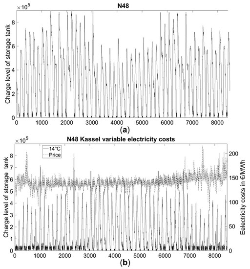 (a) Charge level of storage tank for a fixed electricity price; (b) charge level of storage tank for variable price scenarios.