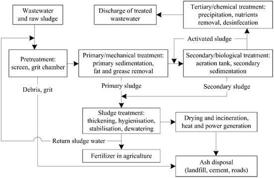 Sewage sludge is a by-product of wastewater treatment plants (WWTP), considered valuable for its content of nutrients and energy but also a potential threat to humans and the environment because of the presence of organic pollutants and heavy metals. Sustainable solutions and the best available techniques for the treatment and disposal of sewage sludge, including recovery of energy and nutrients, are currently being discussed in the European Union (EU) [1]. The situation is particularly urgent in large and densely populated cities, which are producing large quantities of sewage sludge and have limited available surface area for its processing and disposal. The amount of sewage sludge produced in the EU per year was 10 million tonnes in 2008, 11.5 million tonnes in 2015 [2] and is expected to approach 13 million tonnes of dry matter (DM) by 2020 [3]. The quantity of sewage sludge generated in WWTPs is increasing with the progressive expansion of wastewater networks, but also due to population growth and industrial development. After adopting the Directive concerning Urban Wastewater Treatment 91/271/EEC, EU member states agreed to implement primary, secondary, and tertiary wastewater treatment processes (Figure 1), starting from large agglomerations and subsequently moving onto smaller ones.